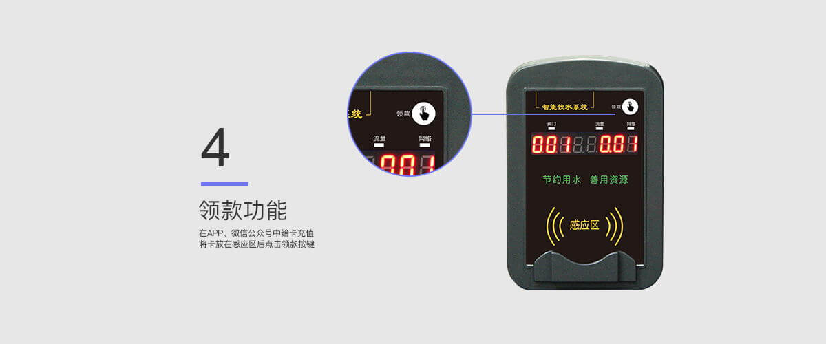 - 可接入微信公眾號,無人值守,用戶自助充值。支持領(lǐng)款和消費的一體機。